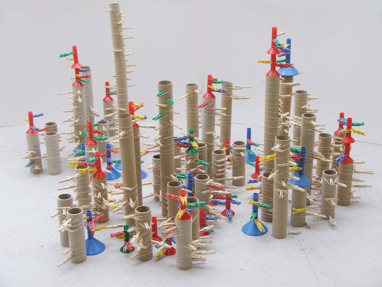Dawn Stringer creates sculptures and installations using everyday objects that get overlooked within our lives. The artist creates floor-based work where small plastic objects mutate and invade the space, and creates tall structures, where plastic baskets balance on top of clothes pegs; these pieces can resemble futuristic cities. She finds a hidden potential within objects and arranges them without using any permanent fixings, to invest a change of state and form. For example, slotting a set of dominos into the slits of a washing basket. The sculptures are predominantly made of primary colours, due to the manufactured colour of the objects.