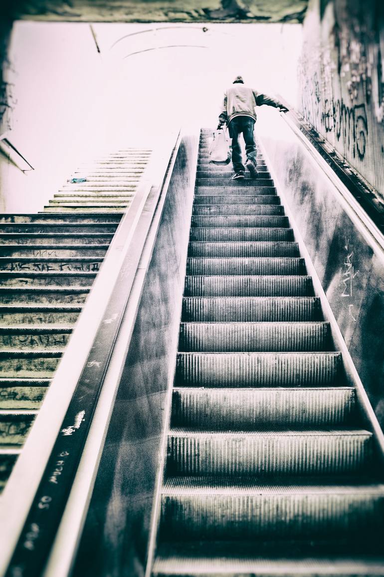 Urban Climber ascending an uninviting escalator from out the depths into the light.