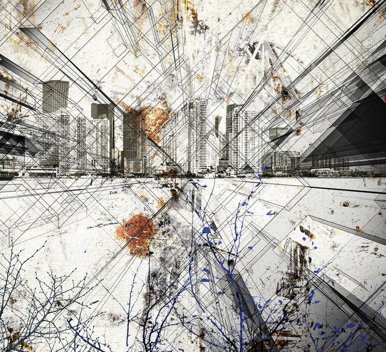 Steven Irwin is a UK-based artist whose work examines the fragility and collapse of contemporary civilisation through layered photomontage, mixed media and sculptural assemblage. Drawing upon Vanitas traditions, his images explore decay, entropy and the impermanence of urban life. Working with both analogue and digital processes — from scratched negatives, chemical staining and rusted surfaces to complex digital compositing — Irwin creates dystopian cityscapes where human figures dissolve into the architecture around them. These fractured environments reflect themes of surveillance, political control, overdeveloped cities, and the psychological impact of modern urban existence. Series such as Slave New World, Black Sun and City of Lost Souls interrogate the tension between technological progress and societal disintegration, reimagining skylines and structures as monuments to both ambition and ruin. His more recent assemblages extend these concerns into physical space, incorporating corroded metal, industrial debris and found objects as contemporary Vanitas symbols. Curator Adriana Marques (Rise Art) writes: “Irwin’s take on our dense urbanscapes reminds us that even bricks and mortar don’t last forever. These layered works test the boundaries of photography and bring a sense of organic vitality back to our cities.” Irwin’s background as an award-winning filmmaker informs the cinematic quality of his imagery — immersive, atmospheric, and rich in narrative tension.