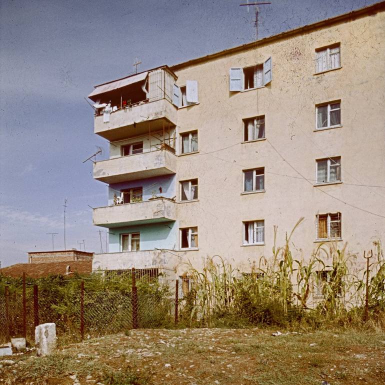 Luca Brogi Urban turn - Optional - Albania 1992 Photographic project focused on collecting images of specific urban living environments. Image scanned from slide dia chrome, printed 42x42 cm on with white border on 315 g, 100% cotton ISO 9706 Natural White (without brighteners) Baryta pa...