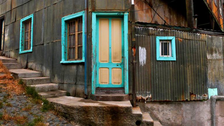 Image size: 25 x 14 cm / Overall size: 40 x 30 cm. White margins. Typical house made of corrugated iron on one of the hills of Valparaíso, Chile.