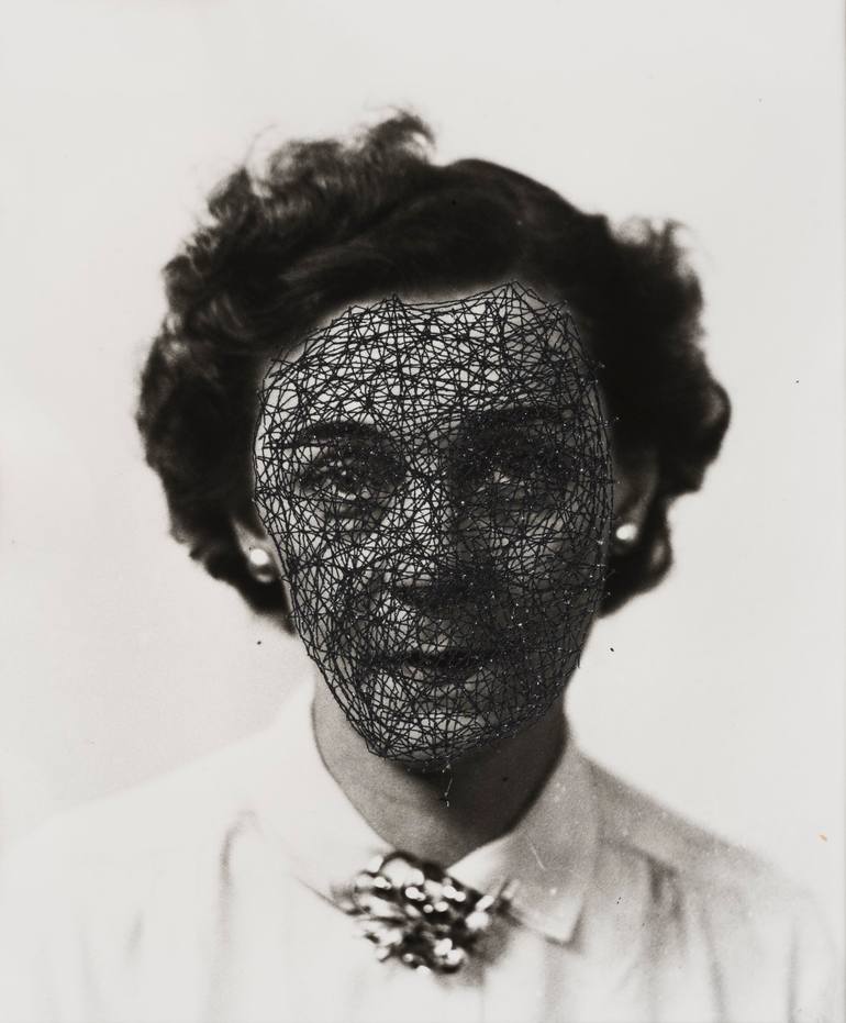 The glass negatives for this work come from Rensler's Portrait Studio in Cincinnati, Ohio, which closed in 1989 after over 80 years in business. Using the negatives, I made the print and then added machine stitching, resulting in a veil, network of veins or a mask. The effacing of the woman's featu...