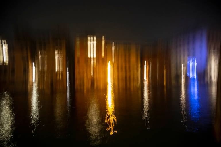 Venice at night, Grand Canal and palaces at night, reflections and light painting. LOEBER-BOTTERO Limited edition of 3. The photograph is printed on high quality paper, with the personal control of the photographer. For over twenty years, Stephan Loeber-Bottero has covered every inch of the labyri...