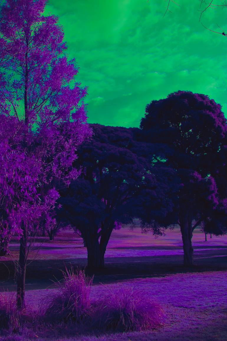 “Verdant Dreams, Ultraviolet Shadows” is a surreal infrared landscape that reimagines the natural world through a dreamlike lens. Bold purples and deep violets dominate the foliage, while an emerald-green sky looms overhead, transforming a tranquil grove into an otherworldly realm. The unnatural col...