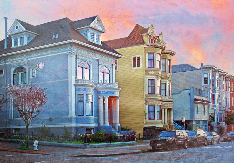 Iconic sunset image of San Francisco Victorian Painted Ladies on Page St in San Francisco.