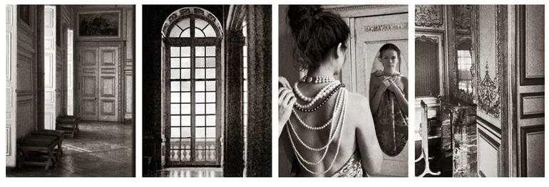 A (secret) tour through the corridors at Versailles . . . This is a quadriptych, consisting of Vie Au Chateau nrs. I, II, III and IV. It is available as four separate prints 40 cm high, or put together in one single print measuring 21x62 cm. On request, the single print can be supplied in a mount.
