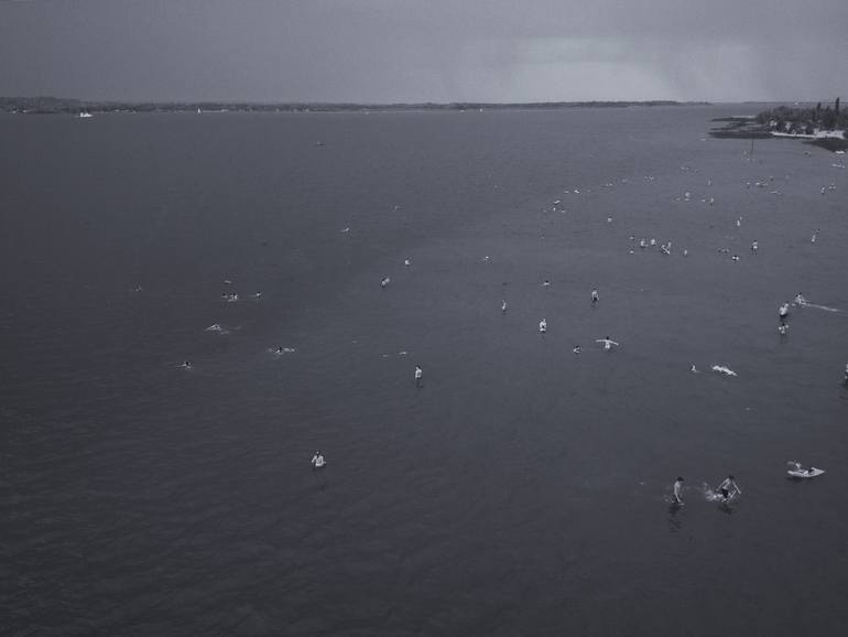 View on Volga river from Saratov bridge. Saratov, 2015. Swimmers, local beach, dark sky, Volga river, Monochrome, landscape.