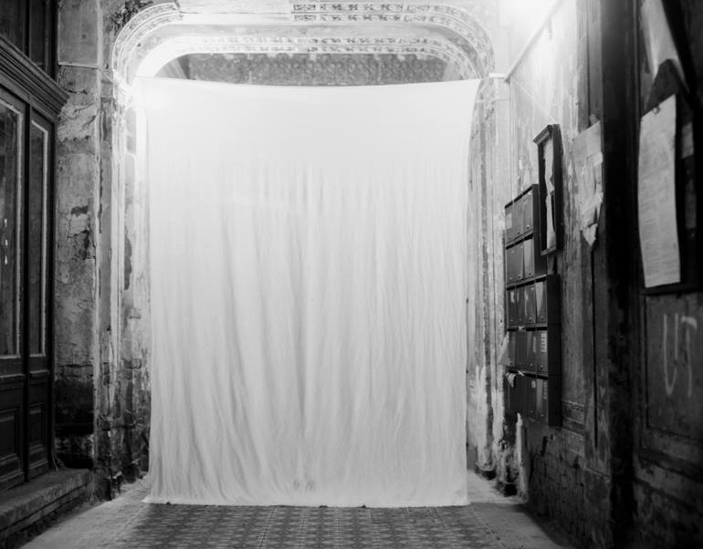 View on Alley is an analog, hand made back and white gelatin print on Baryta photo paper (from 6x7 cm negative). It shows the gateway of a backyard in Kertész Street in the VII. district in Budapest at night. The view onto the alley is covered with a white bed sheet. This and the light of old lanter...