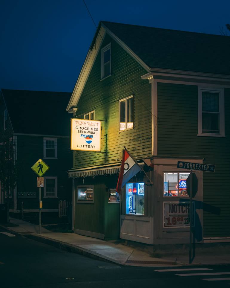 Walyo's Variety store at night, in Salem, Massachusetts - digital photographic print by travel photographer Jon Bilous