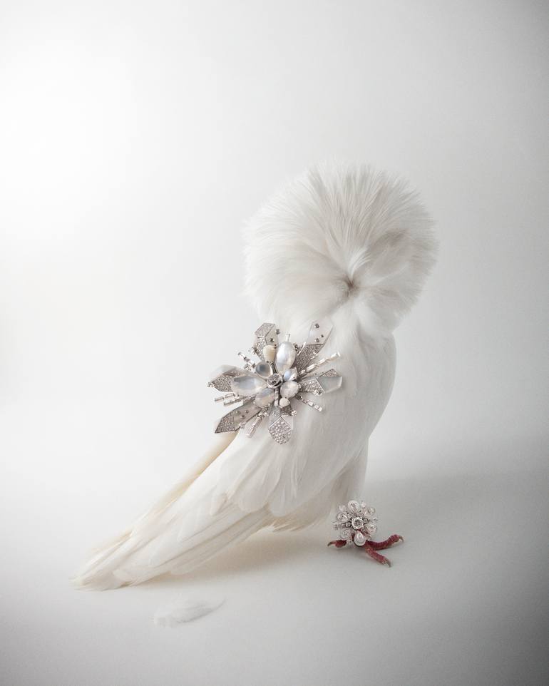 A white Jacobin pigeon wearing very expensive jewellery. Available as a Limited Edition print of 10 Also available as an open print in different sizes.