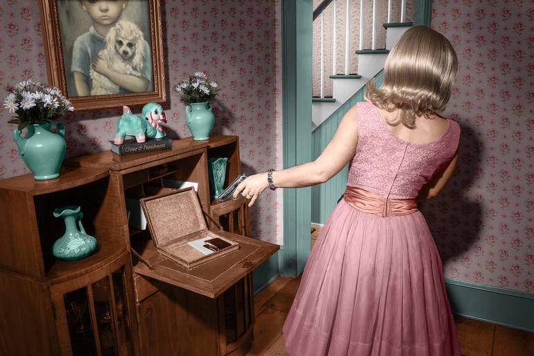 The woman in "Widow Maker" grabs a gun from the sideboard. The image feels like a movie still from a film noir movie. The view is left to wonder what led to this moment, what is she looking at, and who is the intended target? The work is one of 9 images from the project “In an Ideal World” a series ...