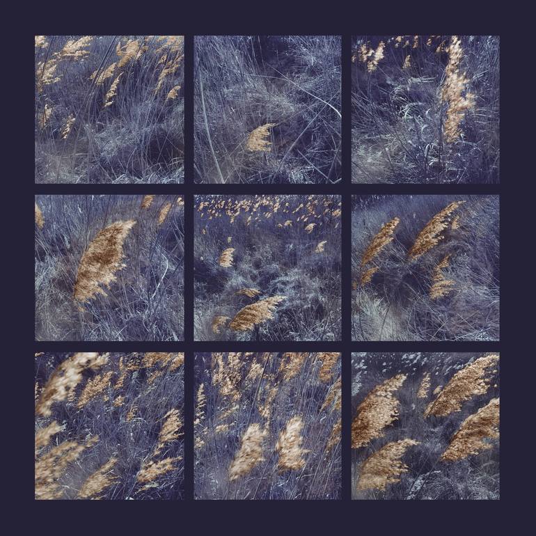 Will of the Wind - printed on brushed aluminium. Photograph manipulation 100x100cm A Dutch reed field in early spring. These are leftover reeds from last year. The wind alters their shape every day and although dead, they still catch and spread the sun's golden light and the reed seems very much a...