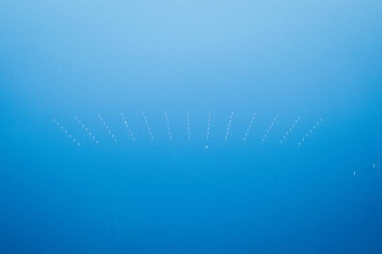 Windmills at sea, seen from a plane. Outside Netherlands.