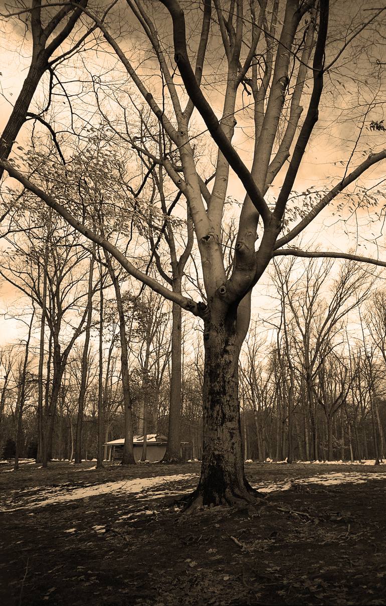 Point & Shoot Film Project. Tall tree waiting for spring. A classic film image, softer of focus with maybe some lovely film "grain". Sepia photo.