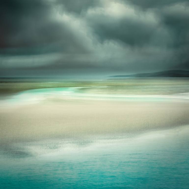 Oversized green and teal seascape - 58 x 58 inches plus 1 inch white border for handling. Title: Winter at the Beach Created from my latest trip to the Isle of Harris in November 2022. The late season light and rain allowed me to capture some amazing shots of the moody clouds as they drifted acro...
