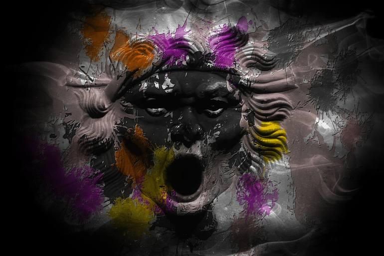 An abstract image of a sacred wall relief reflects the frightening and mysterious image of a tribal medicine man.