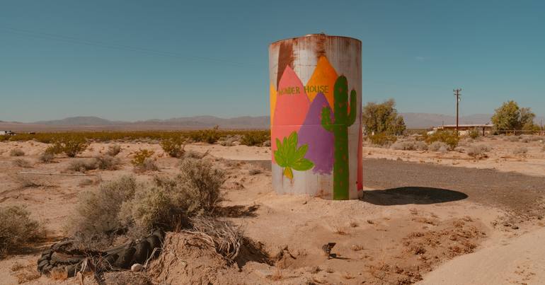 Archival pigment print on Epson Cold Press Bright textured, matte fine art paper. Comes signed and numbered by the artist with a 1" white border for framing. A warm, vibrant sign emblazoned to welcome visitors to Wonder House. This photograph of a desert landscape was taken during a road trip alo...
