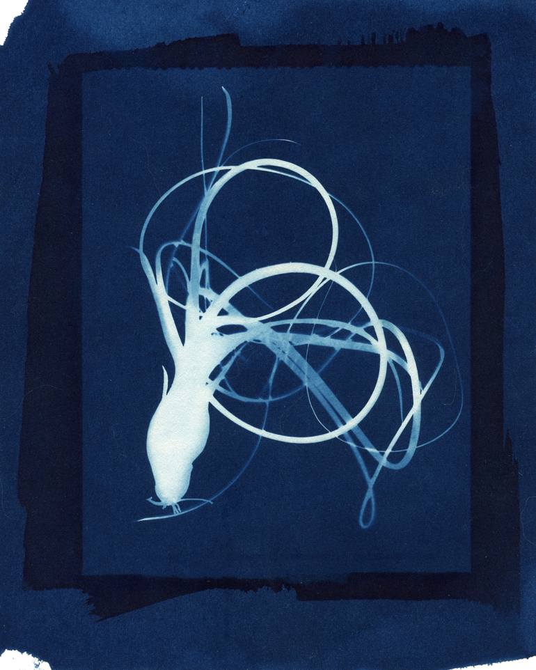 This piece was created using a film negative with a photogram, in a double exposed and double coated cyanotype. Printed on cotton rag 5.5”x7” archival paper, the image is hand coated and signed.