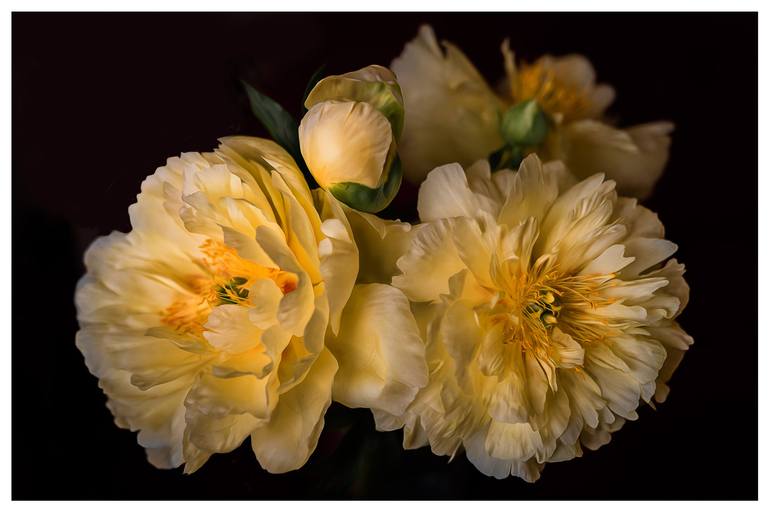 A friend brought me these yellow peonies as a gift from her garden. They smelled so wonderful! The flowers were huge and so lovely that I wanted to preserve them in a photograph. I knew that peonies fade quickly, so I set the vase in an area where I could capture dramatic natural light to show the m...