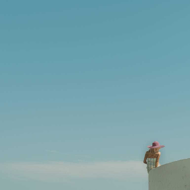 An elegant girl poses on a mediterranean beach before the immensity of the summer sky.