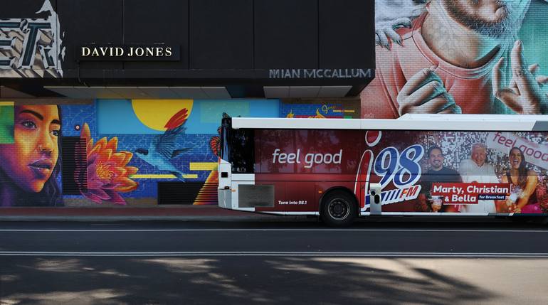 A colorful scene in an Australian city. Nice wall paintings combined with the advertisements on the passing bus gives a beautiful view of one of those passing moments in a city.