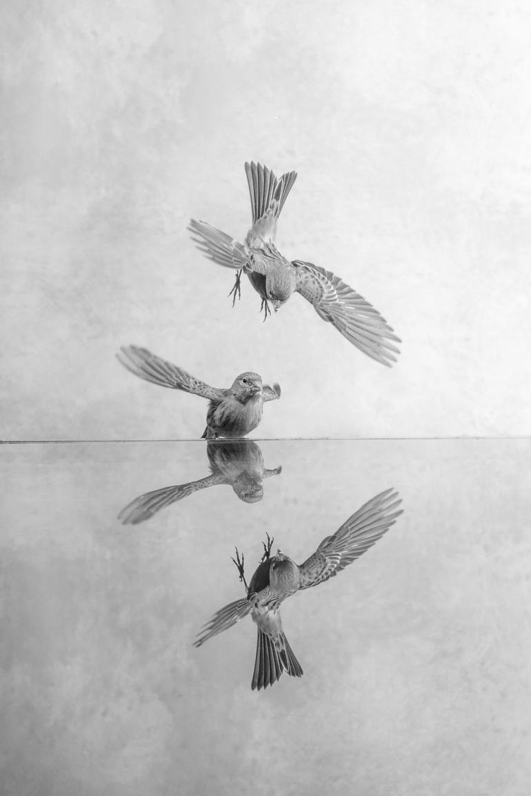 Lured by seeds placed in a backyard pool, canaries alight and, with their reflections, create a lyrical portrait. I built this pool and hung the colored backdrop to set the stage for this image, but it took many months of patient waiting to finally capture what she had envisioned. “I hope people wil...