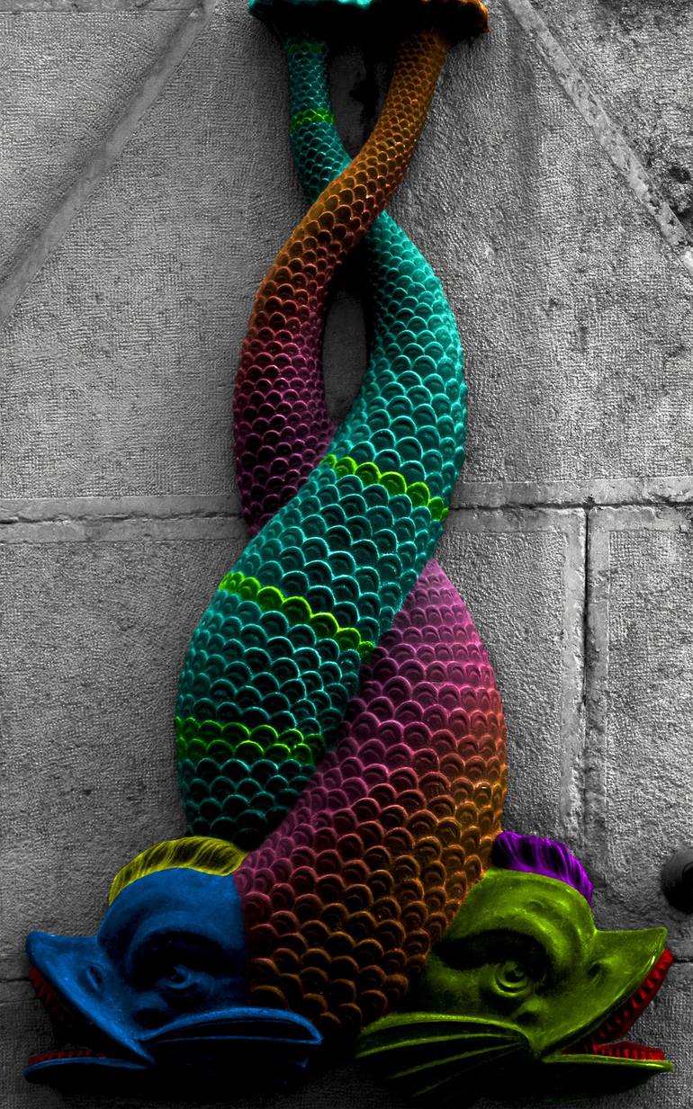 Shot in black and white and painted with colors, a view on some urban details representing some character, animal, flower or another elements digitally transformed to create a new interpretation.