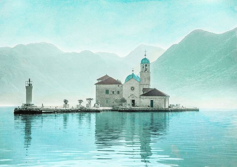Island-church in Montenegro, Black and white photo. hand colored with ink. . Copy printed on quality canvas, protected with UV varnish on the P-800 printer