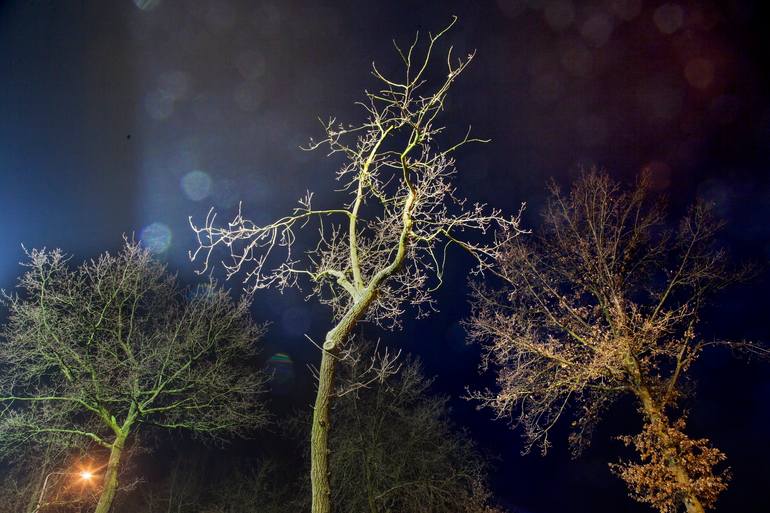from series Nocturnes. It depicts our nature (in the netherlands) after sundown. Only existing artificial light is used. The colours of the work are caused by those lights (street lanterns, passing cars, light of sports parks). This way the viewer is encouraged to see and admire nature in an unexpec...