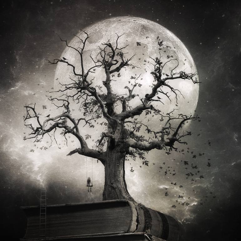 the world of tales Fantasy and surreal image of books with the tree with falling leaves on the top and the girl on the swing looking at the full moon, inspired by writers of fairy tales like Hans Christian Andersen and The Brothers Grimm. Printed on Fine Art paper, Hahnemühle Photo Rag® 308 g/m² F...