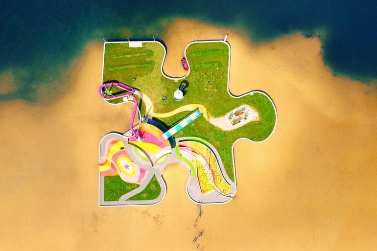 A small bathing island on the lake. The picture is taken with a drone. Look at the details like the water slide and the climbing frame. Printed on Hahnemühle Photo Rag, even the smallest details come into their own.