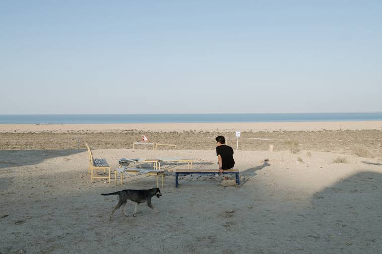 a man is taking a rest after a long ride through the Aral desert - the former bottom of the Aral sea to the remains of the sea.