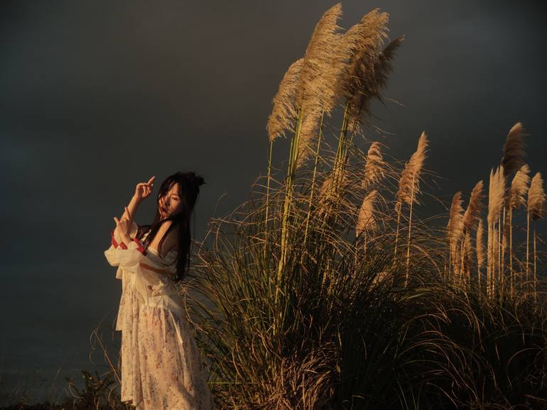 This image explores the themes of self-powered and inner strength. A young woman in a traditional Chinese dress stands alone amidst a field of reeds, her silhouette illuminated by the setting sun. Despite the passage of time and the fading light, she exudes a sense of quiet confidence and self-relia...