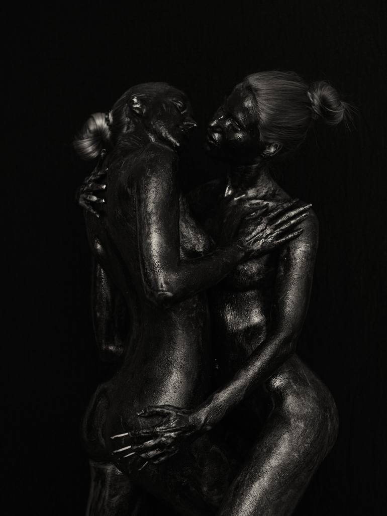 "Temptation" is a visual meditation on intimacy and unity, expressed through a mysterious interplay of light and dark. The two figures, covered in a dark, textured layer, seem to be molded from the same material, their bodies entwined to create the impression of a single entity. The dim background a...