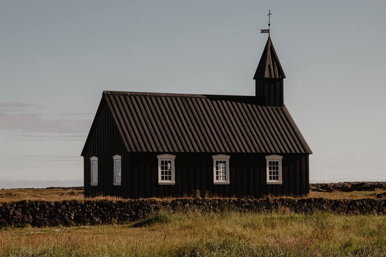 Capturing the timeless beauty of Búðakirkja, the iconic black church in Budir, Iceland, nestled in a remote landscape, combining unique architecture with the country's rich cultural heritage.