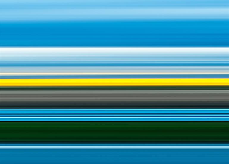 "traveling landscape#6" is a captivating limited edition color photograph, a harmonious blend of abstract and minimalist styles. Printed on Hahnemühle Fine Art Baryta paper, the artwork showcases a mesmerizing abstract landscape, reminiscent of a vibrant sunset and evoking a sense of movement and tr...
