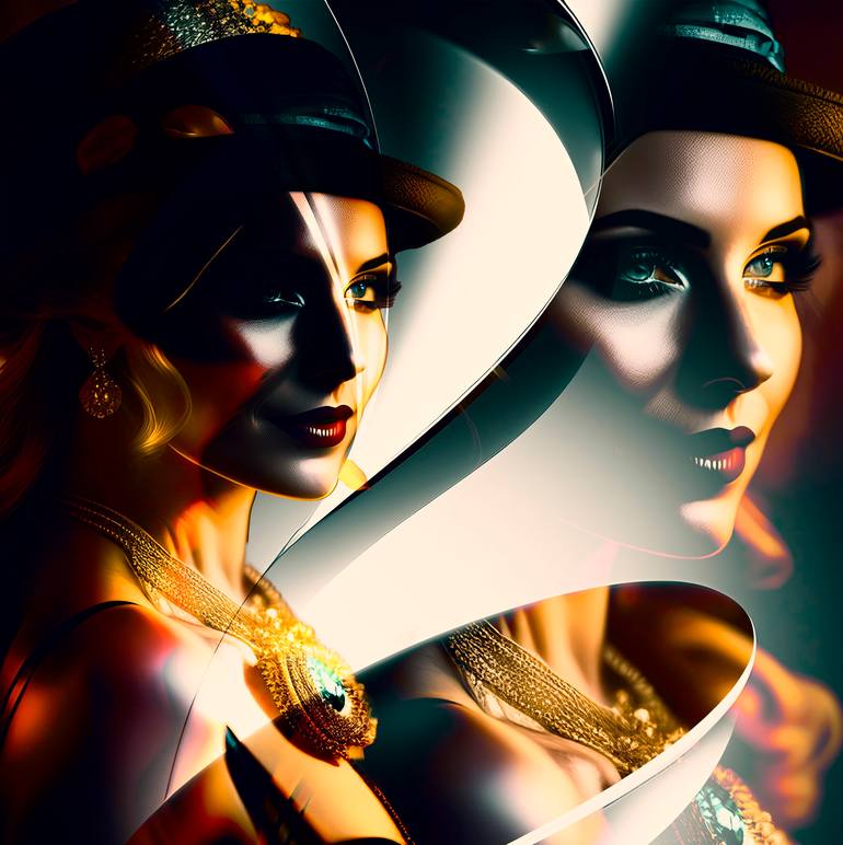 striking manipulated photographic composition of a beautiful female face wearing a hat overlaid and blended