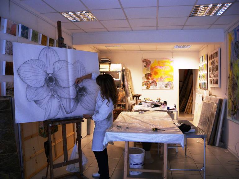 self-portrait inside my studio drawing orchids with a graphite pencil