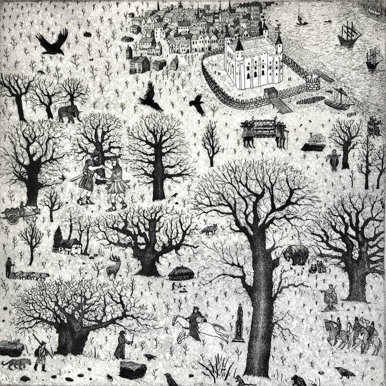 ‘A Tale of London’ is a print that shows the artist’s passion for history and narrative as explored in some key events of the High Middle Ages in London. The story begins with Dick Whittington and his cat, which has been aggrandised to a leopard reflecting both the legendary prowess of the cat and h...