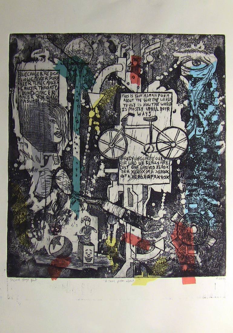 This is a poem etching about cancer, and bicycles, and addiction, and the way we lose ourselves as we age and eventually unbecome. Rare chine colle version. Measurements are image size. Marks - in graphite, under image, "Second state proof, "A small poem about...", M. Glenn (signature)" Accession#...