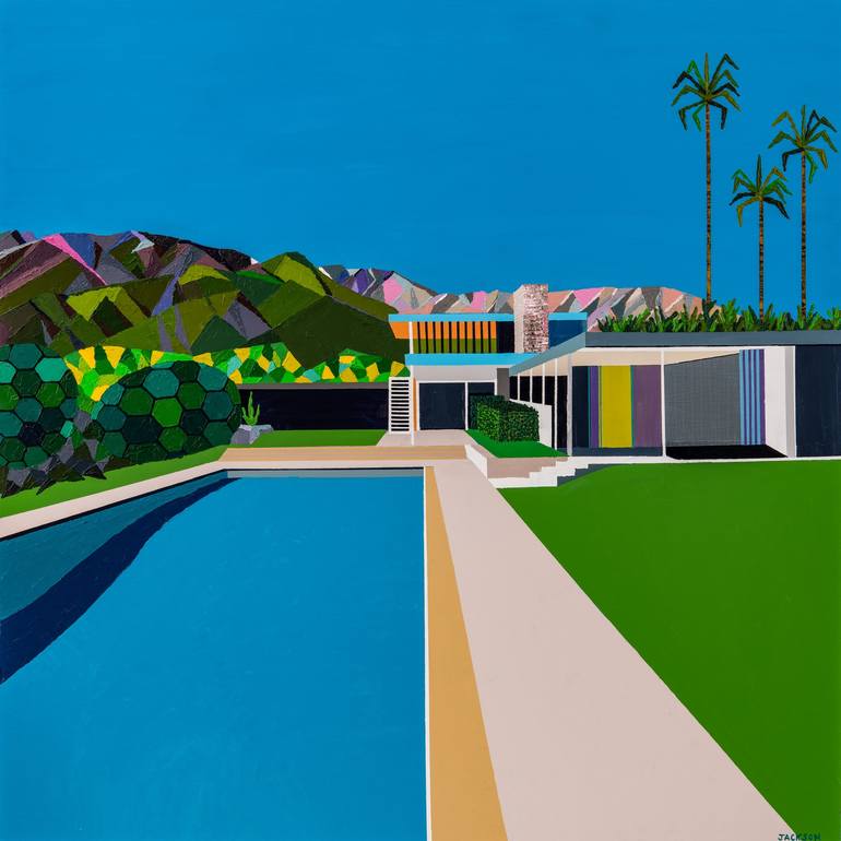 The Modernist architecture of Palm Springs holds great interest for me. I love the contrast of the dynamic modern concrete structures with the striking West Coast landscape beyond. Inspiration comes from Hockney's1960s LA pool pictures, but also the design & furniture from the period too. The s...