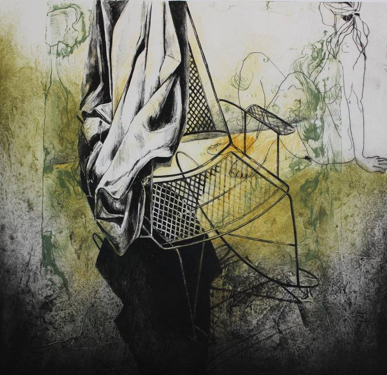 This old rocking chair accompanied me from kindergarten through my childhood and adolescence. When I see such a rocking chair I am taken back to my memories and feel the sun, peace and freedom. I made this artwork with the technique of lithography on an aluminium plate and added the image of the wom...