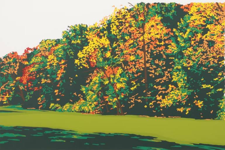 AUTUMN IN FERN HOLLOW original hand printed silkscreen serigraph print in 7 colors by award winning Pittsburgh printmaker Thomas J. Norulak. Image measures 14 inches x 21 inches and depicts a scene along one of the hiking trails in Pittsburgh's Frick Park. Print is unmatted and unframed, print is si...
