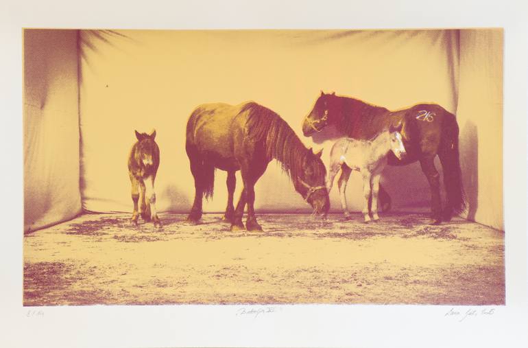 *The print is unframed and will be sent in a tube. Prints look best when combined with other "Battery" images. This peace is made of 3 color layers (pale orange, bright orange and pink) and portrays four draft horses, two mothers Linoska and Narciska with their foals, in a relaxed position, remindi...