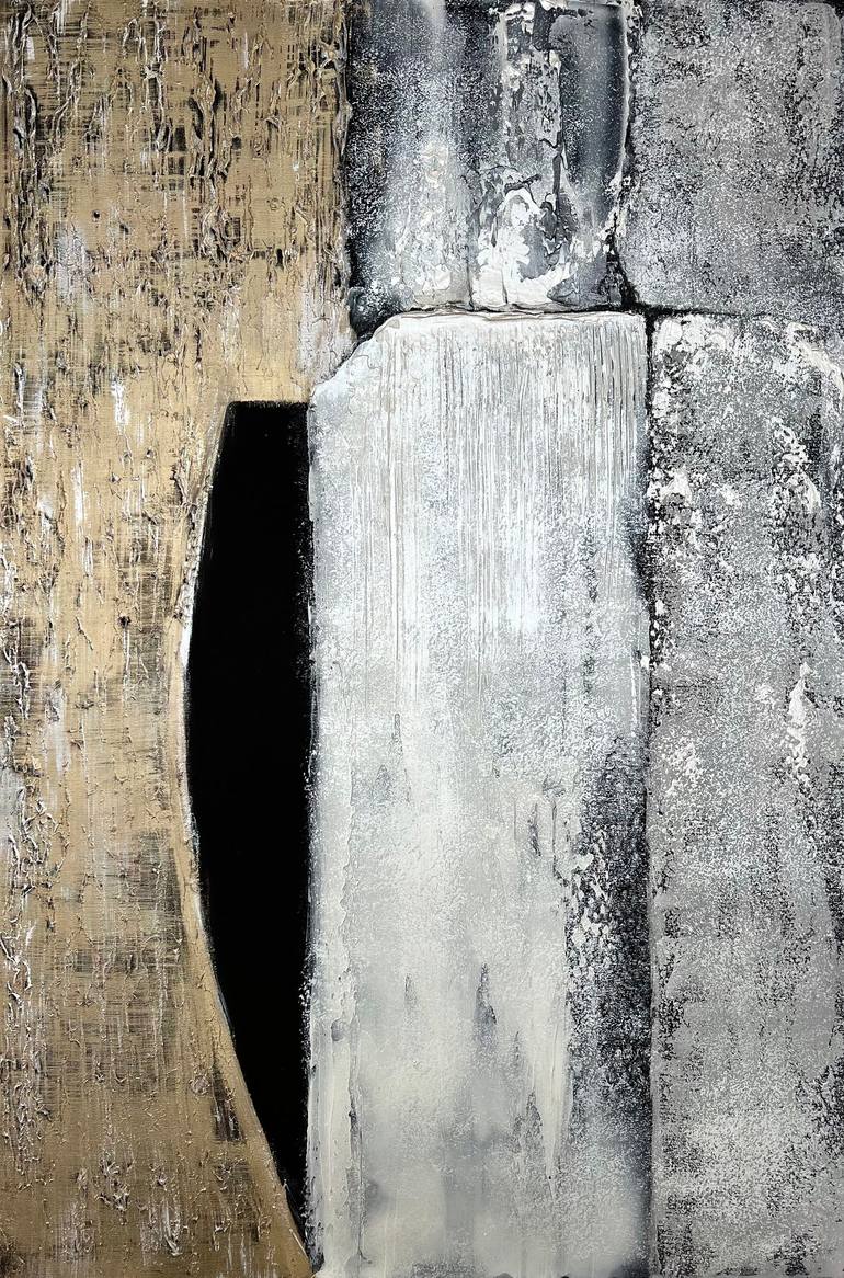 Mother-of-pearl and shades of gold and silver shimmer on the canvas in the light. Luxurious abstraction with an admixture of silver on a gray and black background. Marina created this sumptuous art for a cozy space. The artist dives into this art to create a chic abstraction on canvas. Plays of silv...