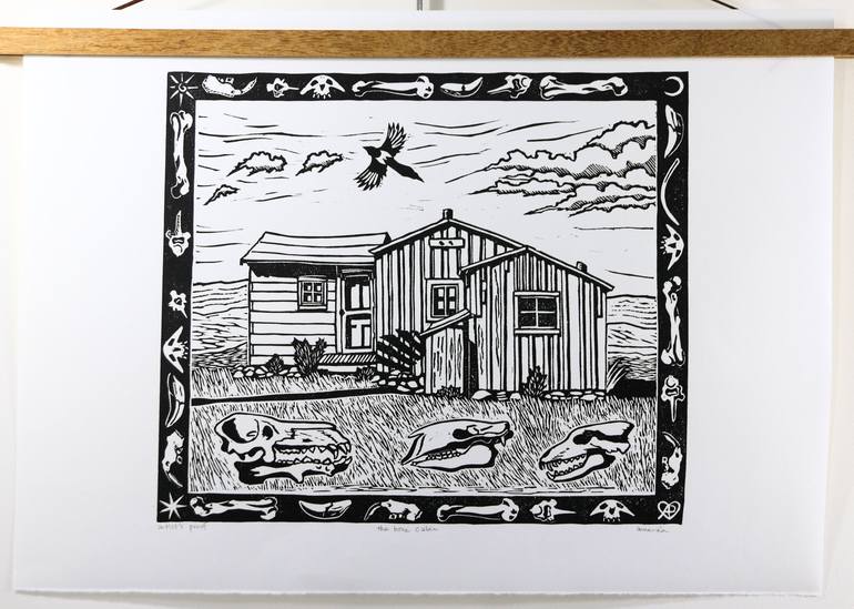 This image was created during my artist residency at Agate Fossil Beds National Monument in western Nebraska and features the historic Bone Cabin, surrounded by illustrated Miocene Epoch fossils—evoking the presence of deep time within this stark and storied landscape. A magpie flies overhead, mid-m...