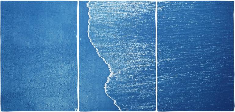 This is an exclusive handprinted limited edition cyanotype. This beautiful triptych shows a smooth wave peacefully reaching the shore in Costa Rica. Details: + Title: Calm Costa Rica Shore + Year: 2020 + Edition Size: 100 + Stamped and Certificate of Authenticity provided + Measurements : 100x210 ...