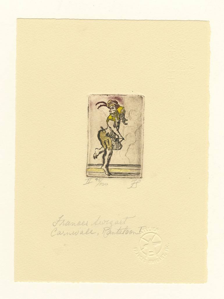 Frances Swigart Steg (b. 1942) is a New Orleans-born painter and printmaker who works mainly in the art of etching. Throughout her five-decade career, Frances has merged the methodical craft of printing with a fearless spontaneity. A master in traditional intaglio etching, she is also known for integrating a range of papers and embellishment techniques. These include printing on hand-marbled papers, water-coloring, gold and aluminum leafing, collage, sewing, and beading. Frances is currently reimagining her archive, creating fresh interpretations from the substantial collection of copper plates that she’s created. Occasionally, she deviates from the original etching. The quick poise drawings (brush and ink) are offered as reproductions. The large triptychs are oil paintings on metal leafed wood.