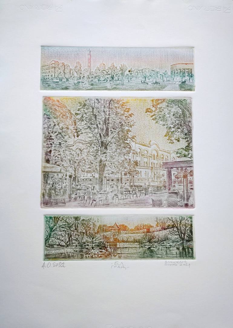Drypoint in color on 220g Fabriano Paper. City of Banja Luka with city marks.
