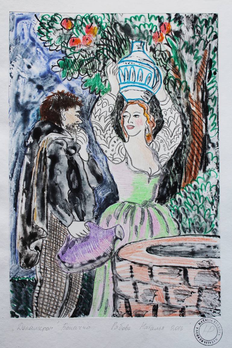 Monoprint on paper. Illustration for "Decameron" Boccaccio. Series was made during summer art residence in Tuscany dear Boccaccio’ house in summer 2016. Intellectual basis of Natalia’ creativity is "the philosophy of unreal» Works indulge in the production of romantic, melancholic and old world i...